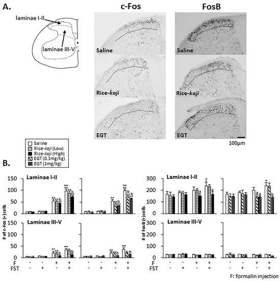 In FST mice, Rice-koji (High dose) and EGT reduced formalin-evoked c-Fos expressions in the NRM (Figure 7) and in both laminae at the DH (Figure 8). These results are consistent with the findings that antidepressant agents, sake, and sake lees inhibited enhanced nociceptive responses in the NRM and DH under psychological stress conditions [8,9,26,66]. Further, the inhibitory effects of 0.1 mg/kg EGT on c-Fos expressions in laminae I–II, but not in laminae III–V, indicated that sensitivity of neural responses to EGT might be exerted in a laminae-specific manner in the DH. Despite a small but significant inhibitory effect of EGT (1 mg/kg, Figure 7B, right panel) on FosB expressions in the NRM, the modulatory effect of Rice-koji and EGT on FosB expressions was smaller than that on c-Fos expressions. Rice-koji and EGT decreased FosB expressions in laminae I–II but not in laminae III–V. The positive correlation of both markers in the DH and that of c-Fos expressions in the NRM evoked by formalin injection supported the notions that nociceptive neural activities in the DH and NRM are significantly correlated with pain-like behaviors [25,64].