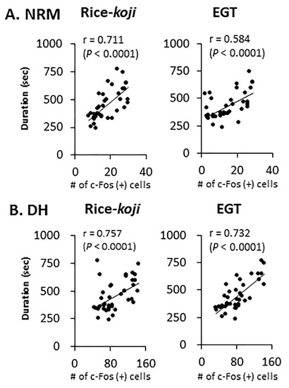 4.2. Effects of Rice-koji and EGT on c-Fos and FosB Expressions in the PVN, NRM, and DH