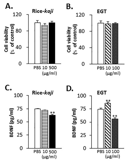 This study also determined the potential effects of Rice-koji and EGT on neural responses using human neuroblastoma cells. SH-SY5Y cells, so-called human neuron-like cells, are used as an in vitro model for neural disorders [31,32,33,34]. First, the cell viability of SH-SY5Y cells was assessed using an MTT assay, which allowed us to evaluate whether Rice-koji itself has any negative effects on cell survival. Next, the level of brain-derived neurotrophic factor (BDNF) of the SH-SY5Y cells was assessed in the presence of Rice-koji or EGT. Because changes in BDNF signaling can cause psychological illness and chronic pain [35], measurements of the level of BDNF in SH-SY5Y cells supported the idea that Rice-koji and EGT exert modulatory effects on neural functions at the cellular level.