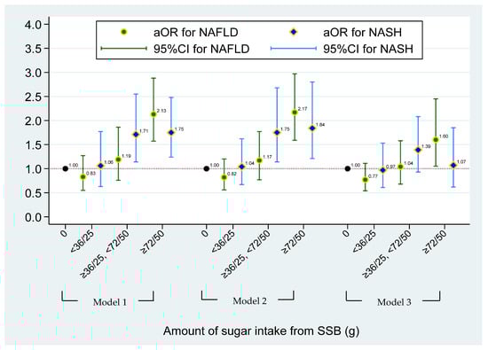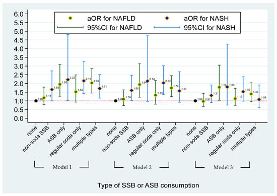 The multinomial logistic regression model between sugar intake from SSBs and NASH/NAFLD status is shown in Figure 1. Compared with non-SSB consumers, individuals who had ≥72 (male) and 50 (female) grams of sugar intake from total SSBs had a significantly higher risk of having NAFLD (aOR = 1.60, 95% CI = 1.05–2.45), after adjusting for demographic factors, risk behaviors, and BMI (Model 3). Figure 2 illustrates the effect of the type of SSB consumption on the risk of having NAFLD/NASH based on the multinomial logistic regression model. Significant higher risks of having NAFLD were found in individuals who consumed ASBs only and multiple types of SSBs when compared to non-SSB consumers before adjusting for BMI status (aOR = 1.94, 95% CI = 1.21–3.13 in ASB-only and aOR = 1.74, 95% CI = 1.24–2.45 in multiple-types-of-SSB consumers) (Model 2). A 1.60-fold and 2.03-fold higher risk of having NASH was found in individuals who consumed non-soda SSBs (95% CI = 1.21–3.13) and regular soda only (95% CI = 1.37–3.02) when compared to non-SSB consumers, respectively, after adjusting for demographic and risk behavioral factors (Model 2). However, apart from the association of ASB drinkers with NAFLD, other aforementioned associations disappeared after adjusting for BMI. After additionally adjusting for BMI status in Model 3, a higher risk of having NAFLD was found in individuals who consumed ASBs only, when compared to non-SSB consumers (aOR = 1.78, 95% CI = 1.04–3.05). (Data were also shown in Tables S1 and S2.)