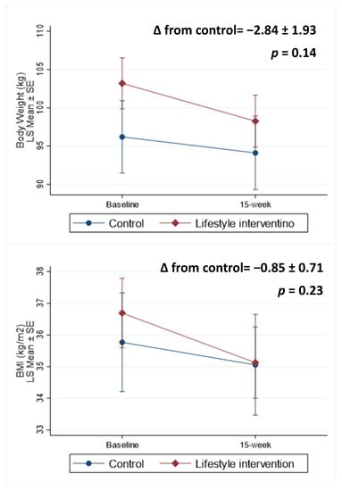 Anthropometric and body composition outcomes are presented in Table 2. Compared with the control group, the lifestyle intervention group lost 2.84 ± 1.93 kg weight (Figure 2, p = 0.14) and reduced BMI by 0.85 ± 0.71 kg/m2 (p = 0.23). Specifically, participants in the lifestyle intervention lost 4.93 kg body weight (p < 0.001) and reduced BMI by 1.56 kg/m2 (p < 0.001), whereas participants in the control group did not have significant changes in body weight or BMI. Among participants who completed the 15-week body composition assessment, eight (42%) participants from the lifestyle intervention group attained clinically significant weight loss (≥5%), and 2 participants (22%) from the active control group attained ≥ 5% weight loss. There were no significant changes in fat mass, percent body fat, lean mass, percent lean, visceral fat mass, and subcutaneous fat mass in either group (Table 2).