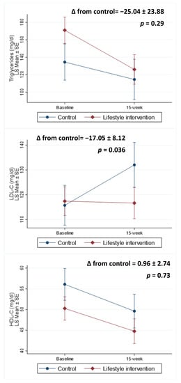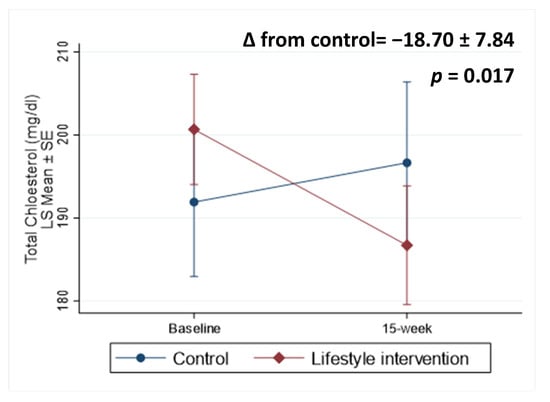 Fasting lipids and inflammatory biomarker outcomes are presented in Table 3. Comparing the lifestyle intervention to the control group, we observed between-group differences in total cholesterol (Figure 3, −18.70 ± 7.84 mg/dL, p = 0.017) and LDL-C (−17.05 ± 8.12 mg/dL, p = 0.036). Although we observed a large magnitude of the difference in change between groups in triglycerides (−25.04 ± 23.88 mg/dL), it was not statistically significant (p = 0.29). Participants in the lifestyle intervention substantially lowered total cholesterol (−13.97 ± 4.71 mg/dL, p = 0.003), triglycerides (−44.95 ± 13.87 mg/dL, p = 0.001), and HDL-C (−5.50 ± 1.65 mg/dL, p = 0.001), while participants in the control group reduced HDL-C (−6.46 ± 2.19 mg/dL, p = 0.003) and increased LDL-C (16.27 ± 6.58 mg/dL, p = 0.013).