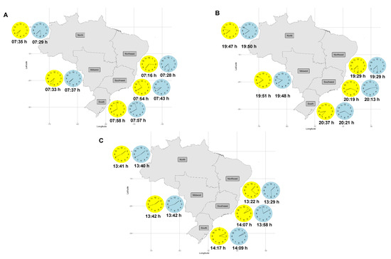 Although there is a lack of studies about regional differences in food intake time, some considerations must be pointed out about the variation of 24 h rhythms across latitudes [16]. An individual’s chronotype may be influenced by characteristics of the light/dark cycle, which varies across latitudes [17]. Thus, there is a latitudinal cline of chronotype in Brazil, considering the geographic distribution of the regions. The difference in daylight exposure across the regions produces a morning to evening direction of chronotype with the increase in latitude [17]. Accordingly, we hypothesize that evening-type individuals are more frequent in the Southeast/South regions due to being located in the highest latitudes of the country. This phenomenon helps us to understand the reason for delayed food intake times in these regions since late chronotype/eveningness has been related to later food intake times [18,19].