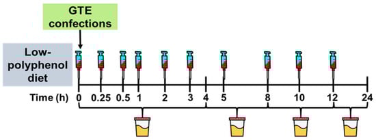 Complete details of the pharmacokinetic study were reported in []. In brief, participants abstained from polyphenol-rich foods for 3 d. In the fasting state (10–12 h) on day 4, participants voided their bladder, and a catheter was inserted into the antecubital vein to collect blood samples at baseline (0 h) and at 0.25, 0.5, 1, 2, 3, 5, 8, 10, and 12 h post-ingestion of a confection formulated with catechin-rich GTE. Urine was collected in timed intervals from 0–4, 4–8, 8–12, and 12–24 h (Figure 2). Participants received standardized meals at 4 h (11:00), 6 h (13:00) and 12 h (19:00) following confection ingestion. Snacks (e.g., pretzels, crackers) were also provided between 13:00–19:00. All foods were devoid of polyphenols and provided to participants in a eucaloric manner based on estimated energy requirements using the Harris–Benedict formula []. Controlled meals were designed to provide 48–55% of energy from carbohydrates, 15–20% from proteins, and 20–35% from fats. No additional foods or beverages, except water, were consumed by participants during the 24 h trial period.