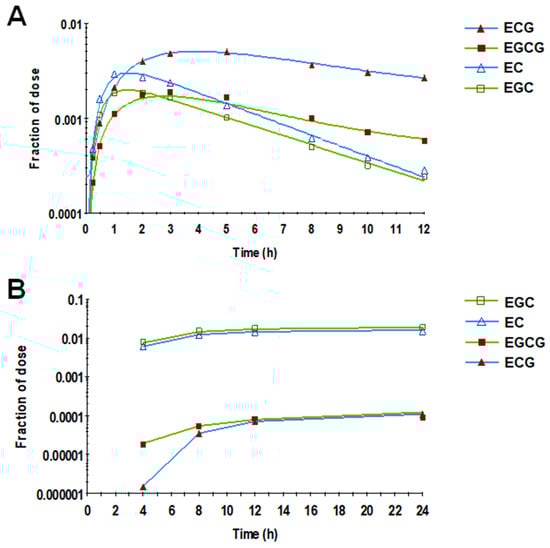 Based on visual inspection of the response profile of the four individual catechins in plasma (Figure 4A), the terminal elimination slopes of the two gallated catechins (EGCG and ECG) were less steep than those of the non-gallated ones (EGC and EC), suggesting a relatively slower rate of elimination of the gallated catechins. In agreement, the non-gallated catechins showed, on average, a 150-fold higher fraction of dose eliminated in urine compared with gallated catechins (Figure 4B).
