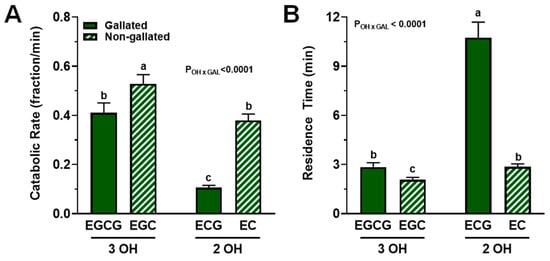 FCR and residence times of catechins in plasma from healthy adults who ingested a green tea extract-containing confection. (A) Catechin FCR was affected by an interaction between the degree of hydroxylation and the presence of a gallate group. While trihydroxylated and non-gallated catechins had greater FCR, their structural combination potentiated the FCR such that ECG > EGCG = EC > ECG. (B) The degree of hydroxylation and presence of a gallate group interacted significantly such that dihydroxylation and gallation most greatly increased residence time of catechins: ECG > EC = EGCG > EGC. Data (means ± SE, n = 19 subjects) were analyzed by two-way ANOVA with Tukey’s post-hoc test. Group means not sharing a common letter are different from each other (p < 0.05) such that a > b > c. Abbreviations: EC, epicatechin; ECG, epicatechin gallate; EGC, epigallocatechin; EGCG, epigallocatechin gallate; FCR, fractional catabolic rate; GAL, gallated; OH, degree of hydroxylation.