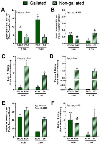Fractional transfer rates of catechins between body pools from healthy adults who ingested a green tea extract-containing confection. (A) The degree of hydroxylation and presence of a gallate group interacted such that dihydroxylated and gallated ECG had a higher fractional transfer rate from upper GI tract to small intestine. (B) The degree of hydroxylation and presence of a gallate group interacted such that gallation slowed down the fractional transfer from small intestine to liver but only for the dihydroxylated catechin ECG. (C) The degree of hydroxylation and presence of a gallate group interacted such that combination of gallation and B-ring dihydroxylation most greatly attenuated the fractional transfer rate of catechins from liver to plasma: EGC > EC > EGCG = ECG. (D) Presence of a gallate group, but not hydroxylation, decreased the fractional transfer rate from plasma to kidneys: EGC = EC > EGCG = ECG. (E) Gallation and dihydroxylation independently decreased the fractional transfer rate from plasma to extravascular tissues: EGC > EGCG > EC > ECG. (F) The effect of hydroxylation and gallation on the fractional transfer from kidneys to urine was identical to that found on the transfer from small intestine to liver. Data (means ± SE, n = 19 subjects) were analyzed by two-way ANOVA with Tukey’s post-hoc test. Group means not sharing a common letter are different from each other (p < 0.05) such that a > b > c. Abbreviations: EC, epicatechin; ECG, epicatechin gallate; EGC, epigallocatechin; EGCG, epigallocatechin gallate; FCR, fractional catabolic rate; GAL, gallated; OH, degree of hydroxylation.