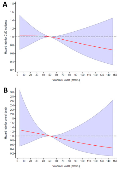 - Sofianopoulou, E.; Kaptoge, S.K.; Afzal, S.; Jiang, T.; Gill, D.; Gundersen, T.E.; Bolton, T.R.; Allara, E.; Arnold, M.G.; Mason, A.M.; et al. Estimating dose-response relationships for vitamin D with coronary heart disease, stroke, and all-cause mortality: Observational and Mendelian randomisation analyses. Lancet Diabetes Endocrinol. 2021, 9, 837–846. [Google Scholar] [CrossRef] [PubMed]