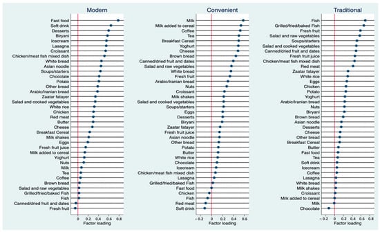Factor loadings of three identified dietary patterns (Modern, Convenient and Traditional).