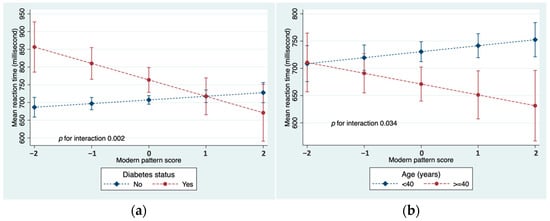 There was a significant interaction between the modern dietary pattern and diabetes in relation to MRT (Figure 2a). An inverse association between the diet and MRT was observed in those who had diabetes. In addition, there was a significant interaction with age (Figure 2b). Among younger participants who were less than 40 years old, the modern dietary pattern was positively associated with MRT, while older participants tended to show an inverse association. There was no statistical evidence that the association between the modern diet and MRT was modified by sex, education, smoking, physical activity, BMI, blood lipids, or hypertension (Supplementary Table S2). No effect modification was found in the associations between the traditional and convenient patterns with MRT.