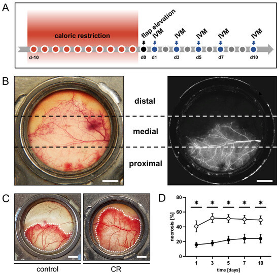 A total of 8 mice were randomly assigned to the CR group. After tracking their food intake to determine their average food consumption prior to the start of the experiments, the animals were transferred to a new cage to prevent them from consuming buried chow or mouse droppings and were provided with 70% of the previously consumed amount of chow. For a standard consumption of 5.1 ± 1.6 g/d of chow, they were provided with 3.6 g/d of chow. The standard consumption during the present study was similar to the amount referenced in other research [29]. Such a 30% CR has already been proven to be effective in previous studies [30,31,32]. The duration of the fasting intervention was based on similar interventions used in the past, spanning from 1 to 4 weeks of CR [11,33]. Moreover, a 10-day intervention would still be feasible in a clinical setting in human patients. After 10 days of 30% CR, a musculocutaneous flap was raised on the back of the animals (Figure 1A) and they had unrestricted access to food for the remaining observation period. Animals in the control group (n = 8) had unrestricted access to standard pellet chow (Altromin) throughout the entire experiment.