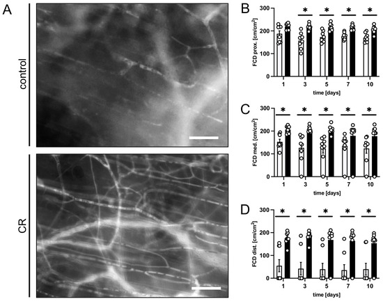 All three observational zones of the CR-treated flaps exhibited a significantly higher FCD over the course of the experiments when compared to the controls (Figure 2A–D). The proximal and medial zones of the flaps in the CR-treated animals presented with an FCD of ~180–200 cm/cm2 (Figure 2B,C), while the distal zone still had a FCD of ~160 cm/cm2 (Figure 2D). The untreated animals showed markedly lower values in the proximal and medial zones (~120–170 cm/cm2) and even only ~40 cm/cm2 in the distal zone (Figure 2B–D).