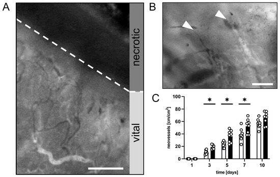 Finally, new vessel formation was assessed in the transition zone between the vital and necrotic flap tissue. Both groups showed changes in the capillary architecture starting on day 3 after the surgical flap elevation. Angiogenic sprouts grew out of the parallelly arranged capillaries of the panniculus carnosus muscle, which had dilated and become irregular in shape and diameter (Figure 3A,B). The CR-treated animals showed a faster onset of angiogenesis with significantly more newly formed microvessels between days 3 and 7 when compared to the untreated controls (Figure 3C).