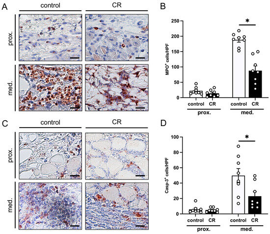 (A): Microscopic images of immunohistochemically stained sections of the proximal and medial zone of flaps in a mouse from the untreated control group and a mouse from the CR-treated group on day 10 after flap elevation. An antibody against the neutrophilic granulocyte marker MPO was used for immunohistochemical staining. Scale bar: 20 µm. (B): MPO+ cells/HPF in the proximal and medial zones of flaps in CR-treated mice (black bars, n = 8) and untreated controls (white bars, n = 8) on day 10 after flap elevation, as assessed by immunohistochemistry. (C): Microscopic images of immunohistochemically stained sections of the proximal and medial zone of flaps in a mouse from the untreated control group and a mouse from the CR-treated group on day 10 after flap elevation. An antibody against the apoptotic marker Casp-3 was used for immunohistochemical staining. Scale bar: 20 µm. (D): Casp-3+ cells/HPF in the proximal and medial zones of flaps in CR-treated mice (black bars, n = 8) and untreated controls (white bars, n = 8) on day 10 after flap elevation, as assessed by immunohistochemistry. Means ± SEM. * p < 0.05 vs. control.