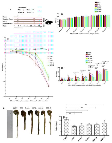 Effects of SGPs on mice with colitis induced by DSS. (A) Schematic representation of the experimental plan. (B) Body weight (BW) gain in SGPs supplemented mice. (C) % BW changes after DSS treatment. (D) DAI scores DSS treatments. (E) Colon size. (F) Average colon length in all groups. Data are shown as means ± SEM (n = 12 mice/group). The differences between the groups were. considered significant at * p < 0.05. In comparison to the control group, significance levels were denoted as * p < 0.05, ** p < 0.01, *** p < 0.001. Different letters indicate significant difference between the respective groups while same letter indicates no significant difference.