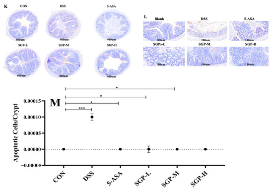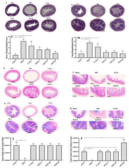 DSS has been shown to cause severe inflammation in both the small and large intestines [26,27,28]. Ileitis and ulcerative colitis were assessed using previously defined macroscopic damage scoring [19]. In contrast to CON mice (Figure 2A,B), DSS mice presented higher histopathological scores, wall thinning, extensive villus sloughing, loss of villi, and severe neutrophil infiltration. However, in the 5-ASA- and SGPs-supplemented mice, the number of intact villi increased, and neutrophil infiltration was reduced. Furthermore, the average colon morphological scores demonstrated that SGP supplementation considerably inhibited the increase in colon macroscopic scores caused by DSS as compared with the group that had received DSS only (Figure 2D). According to our histological analysis, DSS significantly increased inflammation, which was characterized by submucosal edema, reactive epithelial hyperplasia, substantial neutrophil infiltration, and nearly total crypt loss. Comparing therapy with SGPs to treatment with DSS, representative H&E histopathology data showed that the inflammatory response was significantly decreased by SGPs (Figure 2C). The blinded histological injury scores in the distal colon of the DSS+SGP-H group were significantly lower than those in the DSS, DSS+5-ASA, DSS+SGP-L, and DSS+SGP-M groups (Figure 2D).
