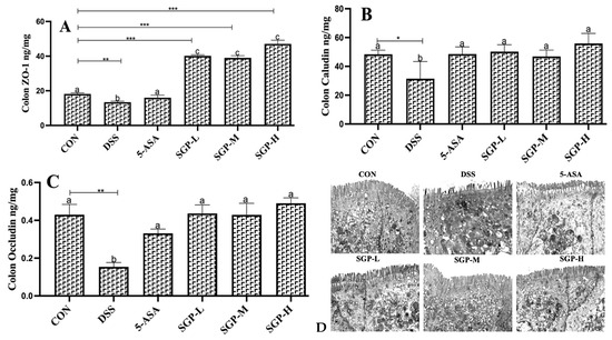 The level of ZO-1 (A), claudin (B) and occludin (C) in the mouse colon were assessed by ELISA. (D) TEM images present the effects of SGPs on structural defects in TJs upon DSS treatment. Data are shown as means ± SEM (n = 12 mice/group). The differences between the groups were considered significant at * p < 0.05. In comparison to the control group, significance levels were denoted as * p < 0.05, ** p < 0.01, *** p < 0.001. Different letters indicate significant difference between the respective groups while same letter indicates no significant difference.