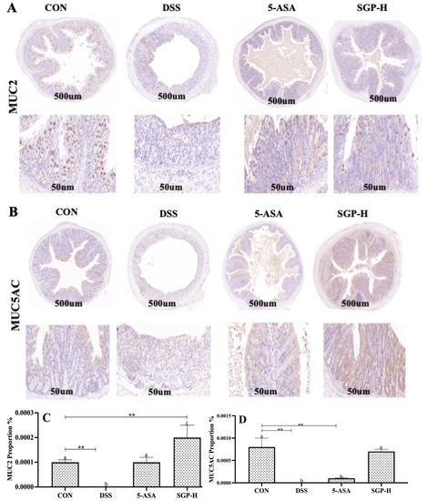 The intestinal tract epithelium is covered in mucus, which acts as the body’s first physical barrier and prevents microorganisms from penetrating the epithelial cells [51]. MUC2 and MUC5AC proteins secreted by goblet cells are the core components of colon mucus [52,53]. Mucus barrier malfunction caused by reduced mucin expression leads to UC [54]. Previous studies have shown that in DSS-treated mice, MUC2 and MUC5AC levels were reduced, which has been confirmed by previous research that DSS-treated mice had lower MUC2 and MUC5AC levels, which resulted in spontaneous colitis development [55,56]. Similarly, our IHC data demonstrated that treatment with DSS considerably decreased MUC2 and MUC5AC expression, whereas SGP-H relieved DSS-induced UC and promoted the expression of mucins such as MUC2 and MUC5AC. Our findings are in line with other studies [53,57], which may provide evidence that SGP-H could alleviate DSS-induced UC by inducing mucin production.