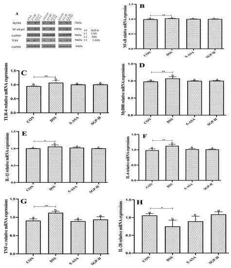 It is widely known that TLR4 and its downstream binding protein MyD88, which in turn activates NF-κB to trigger the production of inflammatory cytokines, are responsible for the DSS-induced increase in intestinal epithelial permeability [32]. As seen in Figure 5A, DSS-treated mice had significantly higher protein and relative mRNA expression levels (Figure 5B–D) of TLR4, MyD88, and NF-κB than the control group, whereas SGP-H treatment markedly decreased the expression of TLR4, MyD88, and NF-κB.