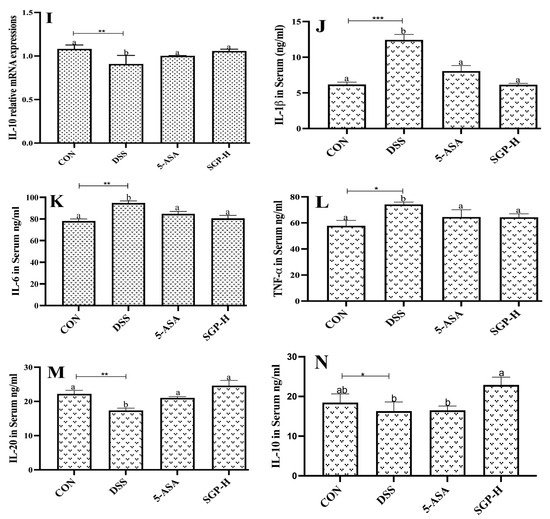 To confirm the ameliorative properties, we further evaluated the effect of SGP-H on pro-inflammatory cytokine concentrations, IL-1β, IL-6, and TNF-α, which are well-known markers of inflammation and play an important role in UC [33]. The results demonstrated that SGP-H treatment considerably decreased both relative mRNA expression (Figure 5E–G) and serum protein levels of IL-1β, IL-6, and TNF-α in the serum of mice treated with DSS (Figure 5J–L). Additionally, SGP-H can strengthen anti-inflammatory actions in mice with DSS-induced colitis. The relative mRNA expression of IL-20 and IL-10 (Figure 5H,I) and serum protein levels (Figure 5M,N) were considerably lower in DSS mice. Taken together, our findings indicate that SGP-H plays an anti-inflammatory role in enhancing gut barrier performance and reducing the pro-inflammatory reactions induced by DSS in mice.