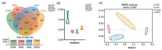 SGP-H enhanced the diversity of the gut microbiota in a mouse model of colitis. (a) The OTUs that were unique to each group are shown in the Venn diagram. (b) α-Diversity analysis: Simpson index at OTU level. (c) Beta-diversity Visualized Using NMDS Plot with Bray–Curtis Dissimilarity Distances.