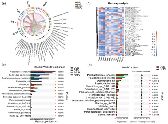 As SGP-H was able to control the diversity of the gut microbiota in mice, we next investigated whether SGP-H affected the composition of the gut microbiota. At the species level, community heatmap analysis represented 50 species (Figure 7a). Chord diagram Figure 7b shows the percentage levels of the top 33 species, and the most dominant species were Lachnospiraceae bacterium, Prevotella_sp_PINT, Tritrichomonas_foetus and Lachnospiraceae_bacterium_A4. The percentage abundance levels of these species in the different treatment groups are provided in Supplementary File S2. To further explore the impact of SGP-H on species in colitis mice, we analyzed species differences to compare the gut microbiota among the CON, DSS, SGP-H, and 5-ASA groups. We compared the gut microbiota between the CON, DSS, SGP-H, and 5-ASA groups to further understand the impact of SGP-H on species in colitis-induced mice. The Kruskal-Wallis H test bar plot at the species level (Figure 7c) shows that SGP-H treatment significantly decreased the relative abundance of Bacteroides_acidifaciens, Porphyromonadaceae_bacterium, Escherichia_coli, Parasutterella excrementihominis, and Firmicutes bacterium_CAG: 124 in colitis mice, and significantly increased Ruminococcaceae_torques, Clostridium_sp_CAG: 510, Eubacterium_sp_CAG: 251, Blautia_sp_An249, Ruminococcaceae_guvareauiii, and Blautia_sp_OF03_15BH. In addition, the relative abundance of these species in the DSS group was substantially higher than that in the SGP-H group, according to Welch’s t-test at the species level (Figure 7d), including Parabacteroides_johnsonii, Parabacteroides_merdae, Parabacteroides_acidifaciens, Desulfovibrio_sp, Parasutterella excrementihominis, Roseburia_hominis, Clostridium_sp_CAG: 510, Eubacterium_sp_CAG: 251, Blautia_sp_An249, Ruminococcaceae_torques, Clostridium_sp_CAG: 632, Anaerosacchariphilus_polymeriproducens, Blautia_sp_An249, Ruminococcaceae_guvareauiii, Extibacter muris, and Blautia_hansenii. Collectively, these findings suggested that SGP-H, as compared with the DSS group, had a more profound effect on the gut microbiota composition in mice with DSS-induced colitis.