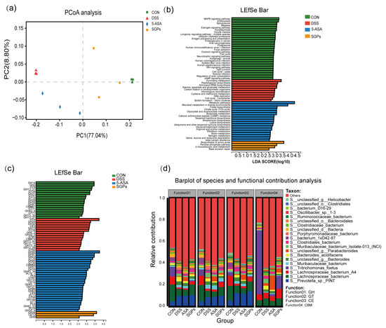 Beta diversity was visualized using non-metric Multidimensional Scaling (NMDS) plots with Bray–Curtis dissimilarity distances (Figure 6c). NMDS plots on rank-order Bray–Curtis distances were used to assess the significance of bacterial composition between the groups. The results of the NMDS analysis showed that groups DSS and 5-ASA clustered closely, while CON and SGP-H clustered closely.