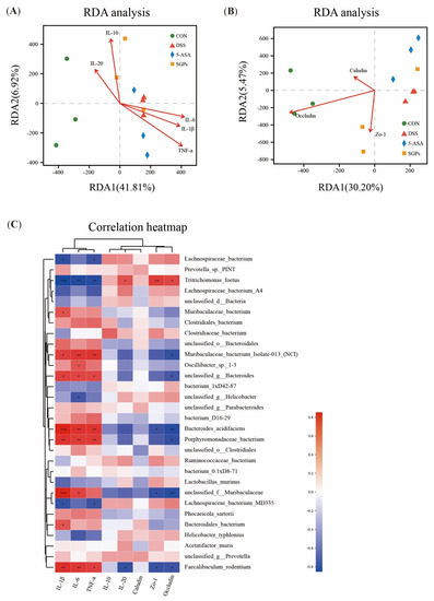 The above findings suggest that SGP-H successfully controlled inflammatory cytokines, tight junction proteins, and gut microbiota and eased the inflammatory impairment in colitis mice. However, it is still unclear whether SGP-H controls the correlation between the gut microbiota, inflammatory cytokines, and tight junction proteins. Redundancy analysis (RDA) and Spearman’s correlation heatmap were used to examine their correlation in more detail. Based on the RDA/CCA analysis (Figure 8a,b), the levels of IL-10, 1 L-20, IL-6, IL-I β, TNF-α (Figure 9A), and tight junction proteins (Figure 9B) of colitis mice in the DSS group differed from those of the GM abundance in the CON and SGP-H groups at the OTU level, whereas the levels of these inflammatory cytokines and tight junction proteins in DSS were consistent with the gut microbiota abundance of the 5-ASA group. Spearman correlation heat map analysis found IL-6, IL-I β, and TNF-α (Figure 9C), to be positively correlated with Faecalibaculum rodentium, Porphyromonadaceae_bacterium, Muribaculaceae bacterium isolate-013_(NCI) and Bacteroides_acidifacien, especially 1 L-6 was positively corelated with Oscillibacter while all these three cytokines were negatively correlated with Lachnospiraceae bacterium and Tritrichomonas_foetus; IL-20 was positively correlated with Tritrichomonas_foetus, and negatively correlated with Faecalibaculum rodentium; ZO-1 was negatively correlated with Faecalibaculum rodentium, Unclassified_f_Muribaculaceae, and Bacteroides_acidifaciens; Occludin was negatively correlated with Faecalibaculum rodentium, Unclassified_f_Muribaculaceae, Porphyromonadaceae_bacterium and Bacteroides_acidifaciens, while ZO-1 and Occludin both these were positively correlated with Tritrichomonas_foetus.
