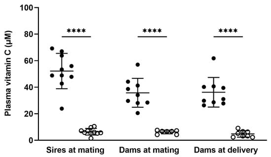 Plasma vitamin C concentrations were assessed in a random selection of sires and dams on the day of mating and in dams on the day of delivery (Figure 1 and Supplementary Table S2). Optimal sires had higher plasma vitamin C concentrations on the day of mating compared to low sires (p < 0.0001). Optimal dams had higher plasma vitamin C concentrations on the day of mating and on the day of delivery compared to low dams (p < 0.0001 for both timepoints). Optimal sires also had higher plasma vitamin C concentrations on the day of mating when compared to optimal dams (p = 0.0096). This difference between males and females with optimal vitamin C intake may be due to the increased turnover of vitamin C that occurs in females around the time of ovulation [2,3,4,5,6,7].