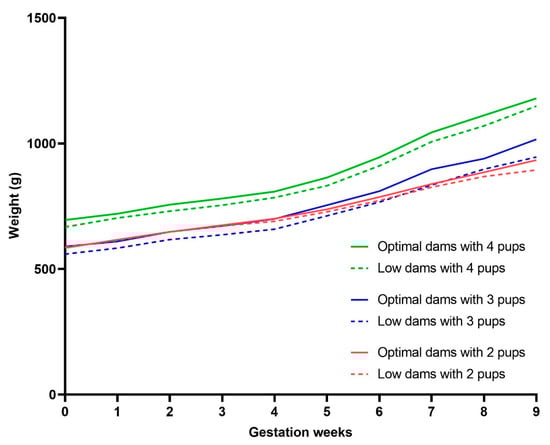 Pregnancy weight gain in litters of equal size. The graph represents the average weight gain during pregnancy (day of mating to week of delivery). Full lines = optimal dams and dashed lines = low dams. Dams with 4 pups (green lines, n = 10 optimal, n = 6 low), dams with 3 pups (blue lines, n = 11 optimal, n = 10 low), and dams with 2 pups (red lines, n = 6 optimal, n = 12 low). Data were analysed using repeated measures mixed-effects two-way ANOVA.