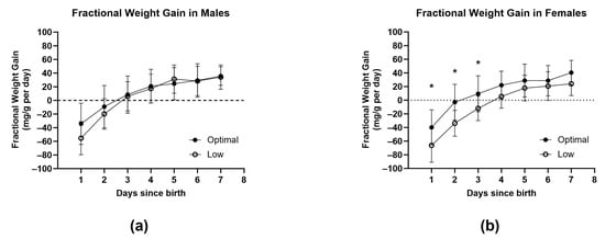All pups allocated to the juvenile or adolescent groups were extensively monitored for the first seven days. A key indicator of health and wellbeing during the neonatal period is daily fractional weight gain (Figure 4a,b and Supplementary Table S8). Low maternal vitamin C intake significantly impaired fractional weight gain for females compared to their optimal counterparts during the first three days of life (postnatal day one; p = 0.0339, postnatal day two; p = 0.0046, and postnatal day three; p = 0.0490).