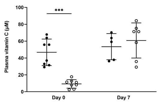 Plasma vitamin C concentrations in neonate offspring (pooled males and females) on day 0 and day 7. At day 0, optimal offspring (full circles, n = 8) and low offspring (open circles, n = 8). At day 7, optimal offspring (full circles, n = 5) and low offspring (open circles, n = 7). All data are presented as group means ± SD. An asterisk indicates significance between bars linked with black lines; *** = p < 0.001. Data were analysed using unpaired t-tests (with Welch’s correction for heterogeneity of variance applied to day 0).