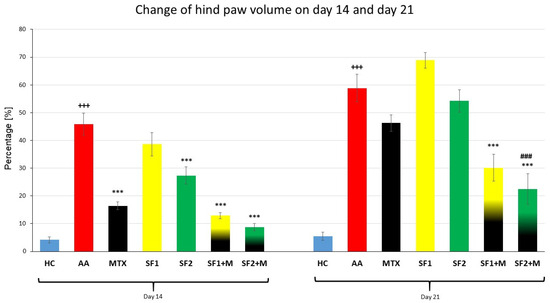 The change of animal body weight was measured on days 14 and 21 of the experiment. The experimental animals were divided as follows: HC—healthy control; AA—adjuvant arthritis; MTX—methotrexate in the dose of 0.3 mg/kg twice weekly; SF1—saffron dosage 25 mg/kg a day; SF1 + M—saffron dosage 25 mg/kg a day in combination with MTX 0.3 mg/kg twice weekly; SF2—saffron dosage 50 mg/kg a day; SF2 + M—saffron dosage 50 mg/kg a day in a combination with MTX 0.3 mg/kg twice weekly. Experimental results were presented as a mean ± S.E.M., n = 8–9 animals per group. ANOVA was performed to evaluate statistical significance for independent variables. The symbols representing the significant change were the following: +++ p ≤ 0.001 AA vs. HC; *** p ≤ 0.001; and * p ≤ 0.05 vs. AA.