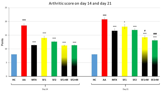 The biometric multi-parameter arthritic score (AS) was significantly increased in the untreated AA group compared to the HC group on 14th and 21st days (Figure 3; +++ p ≤ 0.001 AA vs. HC). The monotherapy with administered MTX, SF1, or SF2 significantly decreased AS compared to the untreated AA group on the 14th and 21st days (Figure 3; *** p ≤ 0.001 and * p ≤ 0.05 vs. AA). The therapy with both doses of saffron in combination with MTX significantly decreased AS compared to untreated AA animals during both experimental days (Figure 3; *** p ≤ 0.001 vs. AA). Moreover, the combination therapy of SF1 + M and SF2 + M significantly decreased AS compared to MTX administered in monotherapy on day 21 (Figure 3; # p ≤ 0.05 and ### p ≤ 0.001 vs. AA-MTX). All treated experimental groups demonstrated a very similar significant pattern on AS compared to the untreated AA group (Figure 3).