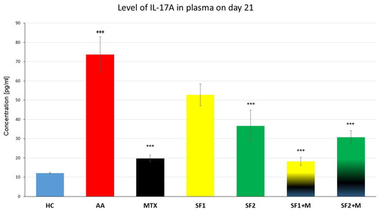 Levels of IL-17A the day 21 of the experiment. The experimental animals were divided as follows: HC—healthy control; AA—adjuvant arthritis; MTX—methotrexate in the dose of 0.3 mg/kg twice weekly; SF1—saffron dosage 25 mg/kg a day; SF1 + M—saffron dosage 25 mg/kg a day in combination with MTX 0.3 mg/kg twice weekly; SF2—saffron dosage 50 mg/kg a day; SF2 + M—saffron dosage 50 mg/kg a day in a combination with MTX 0.3 mg/kg twice weekly. Experimental results were presented as a mean ± S.E.M., n = 7 samples per group. ANOVA was performed to evaluate statistical significance for independent variables. The symbols representing the significant change were the following: +++ p ≤ 0.001 AA vs. HC; *** p ≤ 0.001 vs. AA.