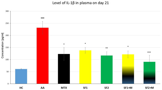Plasmatic levels of interleukin 1β (IL-1β) were evaluated on the 21st experimental day in plasma. The level of plasmatic IL-1β was significantly increased in the untreated AA experimental animals compared to the HC group (Figure 5; +++ p ≤ 0.001 AA vs. HC). The monotherapies with MTX, SF1, and SF2, as well as the therapies with the combinations MTX and SF1 and MTX and SF2, significantly decreased the levels of plasmatic IL-1β compared to the untreated AA animals (Figure 5; *** p ≤ 0.001 for SF2 + M, ** p ≤ 0.01 for SF2 and * p ≤ 0.05 for MTX, SF1, and SF1 + M vs. AA).