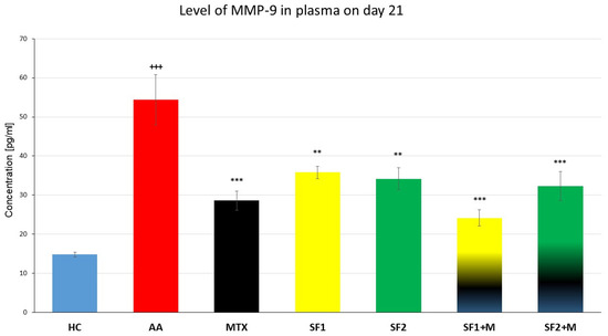 Levels of MMP-9 were measured on the day 21 of the experiment. The experimental animals were divided as follows: HC—healthy control; AA—adjuvant arthritis; MTX—methotrexate in the dose of 0.3 mg/kg twice weekly; SF1—saffron dosage 25 mg/kg a day; SF1 + M—saffron dosage 25 mg/kg a day in combination with MTX 0.3 mg/kg twice weekly; SF2—saffron dosage 50 mg/kg a day; SF2 + M—saffron dosage 50 mg/kg a day in a combination with MTX 0.3 mg/kg twice weekly. Experimental results were presented as a mean ± S.E.M., n = 6–7 samples per group. ANOVA was performed to evaluate statistical significance for independent variables. The symbols representing the significant change were the following: +++ p ≤ 0.001 AA vs. HC; *** p ≤ 0.001 and ** p ≤ 0.01 vs. AA.