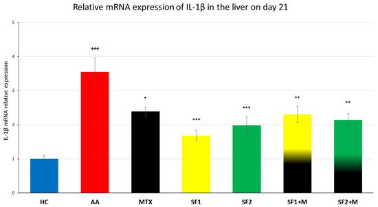 The gene expression of IL-1β in the liver was measured on day 21 of the experiment. The experimental animals were divided as follows: HC—healthy control; AA—adjuvant arthritis; MTX—methotrexate in the dose of 0.3 mg/kg twice weekly; SF1—saffron dosage 25 mg/kg a day; SF1 + M—saffron dosage 25 mg/kg a day in combination with MTX 0.3 mg/kg twice weekly; SF2—saffron dosage 50 mg/kg a day; SF2 + M—saffron dosage 50 mg/kg a day in a combination with MTX 0.3 mg/kg twice weekly. Experimental results were presented as a mean ± S.E.M., n = 6–9 samples per group. ANOVA was performed to evaluate statistical significance for independent variables. The symbols representing the significant change were the following: +++ p ≤ 0.001 AA vs. HC; *** p ≤ 0.001, ** p ≤ 0.01 and * p ≤ 0.05 vs. AA.