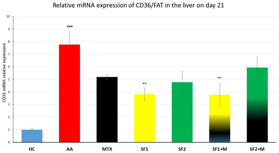 The hepatal gene expression of the cluster of differentiation 36/fatty acid translocase (CD36/FAT) was assessed on day 21 of the experiment. The experimental animals were divided as follows: HC—healthy control; AA—adjuvant arthritis; MTX—methotrexate in the dose of 0.3 mg/kg twice weekly; SF1—saffron dosage 25 mg/kg a day; SF1 + M—saffron dosage 25 mg/kg a day in combination with MTX 0.3 mg/kg twice weekly; SF2—saffron dosage 50 mg/kg a day; SF2 + M—saffron dosage 50 mg/kg a day in a combination with MTX 0.3 mg/kg twice weekly. Experimental results were presented as a mean ± S.E.M., n = 5–7 samples per group. ANOVA was performed to evaluate statistical significance for independent variables. The symbols representing the significant change were the following: +++ p ≤ 0.001 AA vs. HC; ** p ≤ 0.01 vs. AA.