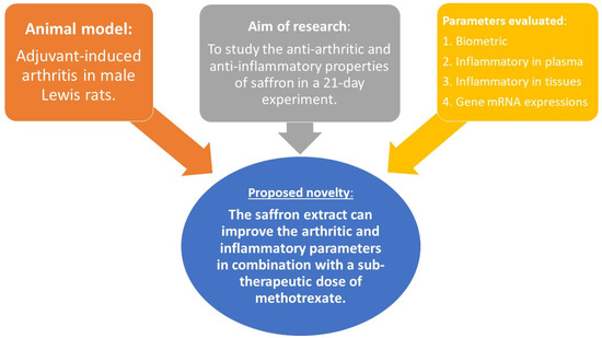 Autoimmune diseases such as rheumatoid arthritis (RA) remain challenging topics for scientists worldwide. Epidemiological studies have shown that the prevalence of RA in Europe and North America ranges from 0.5% to 1% [5,6,42,43]. Even though RA does not represent a direct threat to the life of patients, it is associated with many complications which can lead to the failure of vital organs [44]. RA influences many aspects of the daily life of patients; therefore, it has not only physical consequences but also psychic and socioeconomic impacts [45]. From a pathophysiological point of view, RA is an autoimmune and inflammatory disease, which means that the body’s immune system attacks healthy cells by mistake, causing inflammation (painful swelling) in the affected body parts [46,47]. It is characterized mainly by inflammation of the joints that prograde damage to other organs such as the lungs, liver, and spleen [48]. Due to the aspects mentioned above, there is still an unmet medical need for safe and effective RA management. In the last 50 years, the development of RA treatment has gone from synthetic drugs to biological therapy. However, treatment is still mainly focused on symptoms because the pathophysiological origin of RA remains unknown. Current RA therapy consists of the effective treatment and management of the disease and self-management strategies [49]. Disease-modifying antirheumatic drugs (DMARDs), which reduce the disease’s progression and prevent joint deformity, are typically used to treat RA; biological and targeted DMARDs have been classified as second-line therapies [50]. Non-steroidal anti-inflammatory drugs (NSAIDs) and glucocorticoids have been shown to reduce the pain and inflammation related to RA at the beginning of the therapy, together with conventional synthetic DMARDs (csDMARDs, e.g., methotrexate, sulfasalazine, leflunomide, hydroxychloroquine, etc.), which are the first line of treatment [51]. Among the most prescribed csDMARDs, methotrexate is consistently considered to be the gold standard for RA therapy [52]. On the other hand, in recent years, natural products’ anti-inflammatory and immunomodulatory activities, which are able to control autoimmune inflammation such as RA, have been widely investigated [53,54]. In this original article, we describe the effects of both, 1. the best features of MTX antiarthritic activity and 2. the anti-inflammatory properties derived from natural compounds; in our case, Crocus sativus L. (saffron, SF) extract. To observe the dose-dependen manner, we tested two doses of SF in a monotherapeutical setting and the same doses of SF in combination with MTX (Table 1).