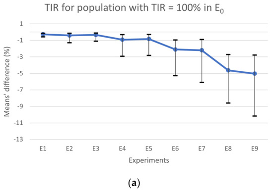 Figure 2a shows the results for TIR, the horizontal line represents the experiments’ mean values, and the vertical lines are the CIs. The results obtained for TBR and TAR means’ differences are plotted in Figure 2b with colored bars, whereas the CIs for the most expressive condition (TBR or TAR) in each experiment are represented by vertical lines. When comparing the results obtained from E0 with those obtained from experiments where the CC error falls within the range of [−∆CHOmax, ∆CHOmax] (i.e., E1, E2, E3, E4, and E5) for the population with TIR = 100%, we observed that the absolute maximum of the differences between means for TBR, TIR, and TAR were 0.84%, 0.92%, and 0.92%, respectively. Additionally, the differences’ absolute maximum in the CIs for TBR, TIR, and TAR were 2.79%, 2.93%, and 2.85%, respectively. However, for experiments falling outside this interval (i.e., E6, E7, E8 and E9), we observed a larger absolute maximum for differences in TBR, which was 5.04%, in TIR was 5.03%, and 4.64% in TAR. In this case, the absolute maximum in the CIs for TBR, TIR, and TAR was 10.40%, 10.17%, and 8.41%, respectively, when compared to E0. According to the guidelines, the maximum time spent in hypoglycemia < 50 mg/dL should be less than 1% and generally, for TBR, it should be less than 4% [3]. Therefore, when comparing E9 with E0, we found that the mean difference for time spent in hypoglycemia < 50 mg/dL was 0.95%, which is close to the limit. Additionally, the TBR was 5.04%, which exceeds the recommended limit.
