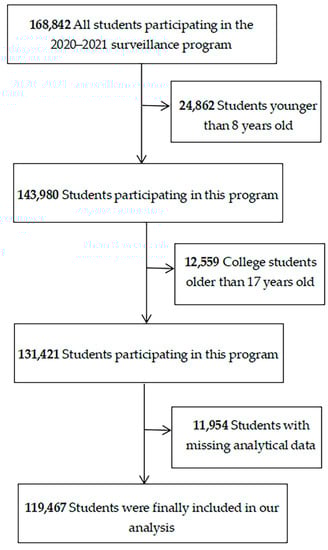 The data for this paper were obtained from the “Surveillance for Common Disease and Health Risk Factors Among Students in Jiangsu Province 2021–2022” by employing a cluster random sampling strategy to select 168,842 participants in Jiangsu Province of China. A self-administered questionnaire was given to each participant to complete. There have been several descriptions of this surveillance project’s specifics []. Some participants in the study were excluded since they were too young to comprehend and respond to the health risk factor assessment (n = 24,862), college students over 17 years of age were not well represented for the wider 17-year-old population (n = 12,559), or because their data regarding the analyzed variables were lacking (n = 11,954). In total, 119,467 students from 8 to 17 years old were finally included in this research (Figure 1). The study protocol was granted exemption by the Ethics Committee of Jiangsu Provincial Center for Disease Prevention and Control. All participants provided informed consent.