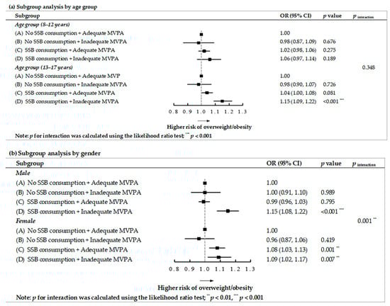 In addition, this paper evaluated the association of age and gender with SSB or MVPA and overweight/obesity. It was observed that female students seemed to be more prone to SSB consumption alone or in combination with inadequate MVPA than their counterparts. A systematic review suggested that compared to boys, girls may be more vulnerable to obesity-related effects of adverse childhood experiences due to their relational sensitivity [], which may be an important reason for the gender differences in the association of SSB with obesity. We found that the group of 13–17-year-olds seemed to be more sensitive than their counterparts to consuming SSB alone, perhaps due to the fact that adolescents consumed SSB as a coping mechanism under academic stress [,]. Similarly, when we observed the joint association of SSB consumption and inadequate MVPA, we noted that the 13–17 age group continued to show more vulnerability, a potential explanation being that adolescents were more physically inactive, thus exacerbating the implications of SSB []. Variations in physiology or hormones may account for age and sex variances between SSB and MVPA in relation to overweight/obesity; the specific mechanisms behind these differences should be studied in additional research.