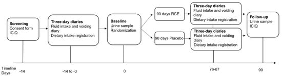The timeline of the study is illustrated in Figure 1. At screening, women were assessed for eligibility using the ICIQ questionnaires. Prior to baseline and follow-up visits, the women were asked to complete study diaries to measure their voiding habits and diet. The women were allocated to treatment groups based on randomization at the baseline visit, at which time a catheterized urine sample for culturing was collected. At the follow-up visit, the ICIQ questionnaires and a urine sample were collected again.
