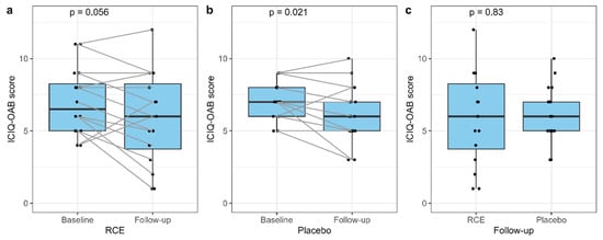 A tendency was seen towards a decrease in the ICIQ-OAB score in the RCE group from baseline to follow-up (with a median score of 6.5 (5.0−8.25) at baseline versus 6.0 (3.75−8.25) at follow-up (p = 0.056)) (Figure 3a). In the placebo group, the median ICIQ-OAB score declined significantly from 7.0 (6.0−8.0) at baseline to 6.0 (5.0−7.0) at follow-up (p = 0.021) (Figure 3b). No significant difference in the ICIQ-OAB score between the two groups was found at follow-up (p = 0.83) (Figure 3c).