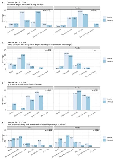When looking at individual items in the ICIQ-OAB questionnaire, we found no differences in urinary frequency (question 3a) or nocturia (question 4a) for either the RCE or placebo group (Figure 4a,b). However, a tendency towards a reduction in urgency symptoms (question 5a) in the RCE group was observed at follow-up compared to the placebo group (Figure 4c). The shift was, however, not significant. There appeared to be a significant improvement in the number of daily urge urinary incontinence episodes (question 6a) for the placebo group (p = 0.021), which was not observed in the RCE group (p = 0.212) (Figure 4d).