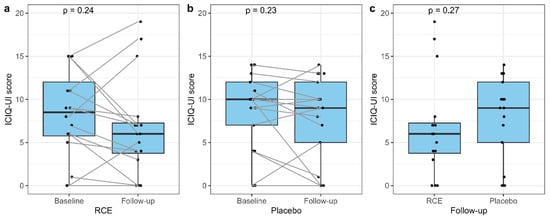 No significant difference in the ICIQ-UI score was found between baseline and follow-up in either the RCE group or placebo group (Figure 5a,b), indicating no improvements in the severity of urinary incontinence symptoms after intervention. Similarly, no significant difference was found at follow-up between the two groups (median score 6.0 (3.75−7.25) for the RCE group and 9.0 (5.0−12.0) for the placebo group, p = 0.27) (Figure 5c).