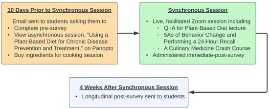 Ten days before the synchronous session, students received an email with an overview of the curriculum and links to the pre-survey and first module. The first module, “Using a Plant-Based Diet for Chronic Disease Prevention and Treatment”, was delivered asynchronously using Panopto, a video streaming service that incorporates embedded quizzes. Participants were asked to complete the pre-survey before viewing the lecture and were given access to the lecture regardless of study participation.