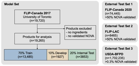 The processing levels of packaged foods and beverages are categorized under the NOVA food classification system, which includes four groups. NOVA 1: unprocessed or minimally processed foods; NOVA 2: processed culinary ingredients; NOVA 3: processed foods; and NOVA 4: ultra-processed foods []. The NOVA system of food classification is based on the nature, extent, and purpose of food processing to identify ultra-processed food products [,]. NOVA categories were manually assigned to foods in FLIP-Canada 2017 using methods that have been previously described []. Briefly, a trained nutrition researcher evaluated the list of ingredients for each food in FLIP-Canada 2017 and assigned them a NOVA food category, then a second researcher independently categorized a random 20% of the analytic sample. Weighted Cohen’s Kappa test was used to estimate the inter-rater reliability, which found an almost perfect agreement []. In addition, we manually determined the NOVA categories of randomly selected food products in the FLIP-LAC and USDA-BFPD databases to create validation subsets.
