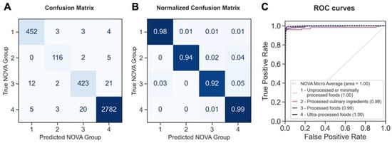 The performance of NOVA classification using a fine-tuned language model *. (A) Confusion matrix. (B) Normalized confusion matrix. (C) Receiver operating characteristic (ROC) curves and aera under the ROC. * NOVA Group 1, unprocessed or minimally processed foods; NOVA Group 2, processed culinary ingredients; NOVA Group 3, processed foods; and NOVA Group 4, ultra-processed foods.